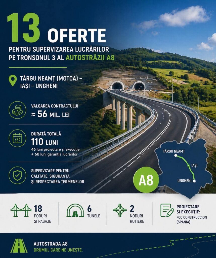 Compania Națională de Investiții Rutiere a primit 13 oferte la licitația pentru supervizarea lucrărilor pe Tronsonul 3 al A8, Târgu Neamț (Moțca) – Iași – Ungheni. Vorbim despre un contract de aproximativ 56 milioane lei, cu o durată totală de 110 luni, care acoperă toate etapele: de la proiectare și execuție, până la perioada de garanție.