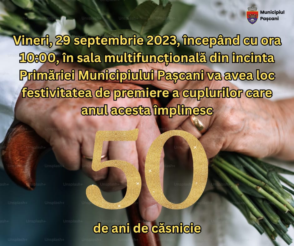 Primăria Pașcani va premia cuplurile care au împlinit 50 de ani de la căsătorie, în cadrul unui eveniment care va avea loc pe data de 29 septembrie. Acesta se va defășura la sediul Primăriei, începând cu ora 10.00.
