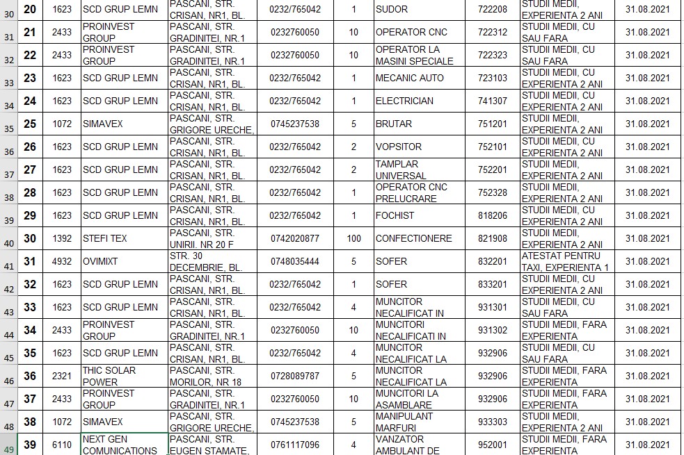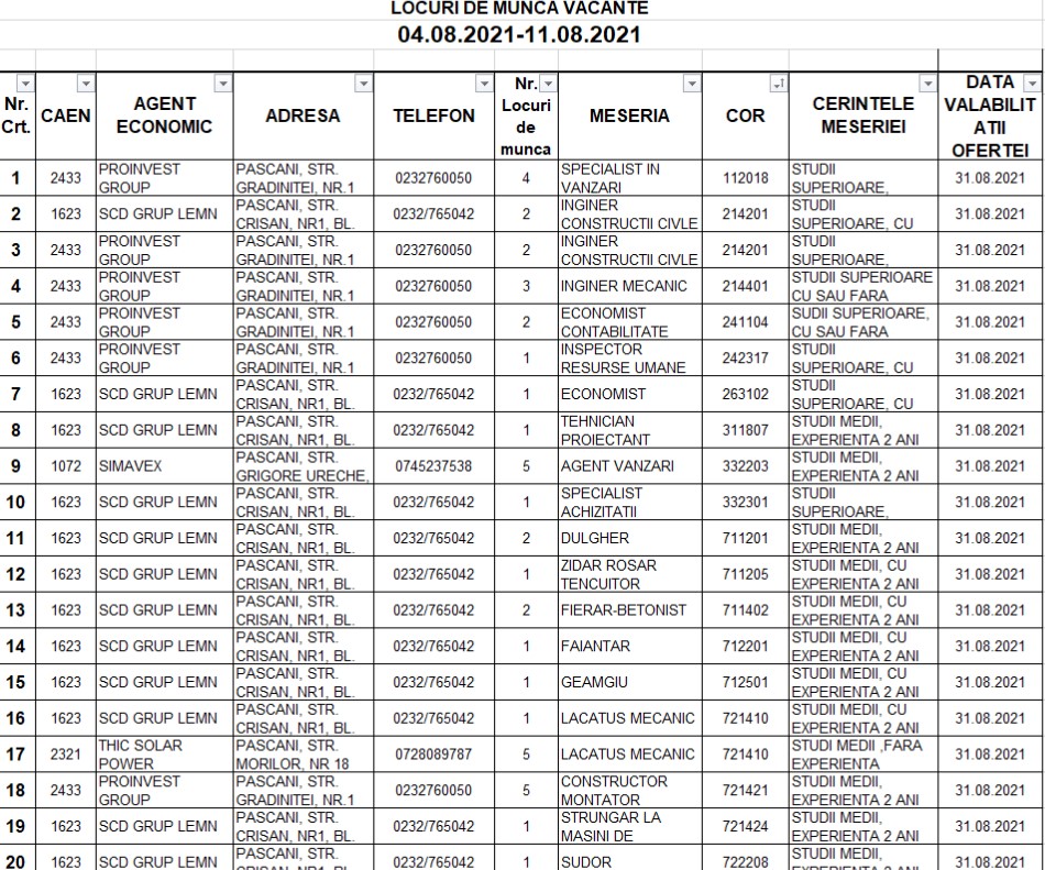 Agenția Județeană pentru Ocuparea Forței de Muncă Iași a publicat lista locurilor de muncă vacante, din această perioadă, la Pașcani. Persoanele care sunt în căutarea unui loc de muncă, au la dispoziție 223 locuri de muncă vacante, în diferite domenii.