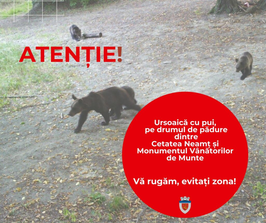 Primăria orașului Târgu-Neamț informează populația că, pe traseul de pădure dintre Cetatea Neamț și Monumentul Vânătorilor de Munte a fost observată o ursoaică însoțită de trei pui.