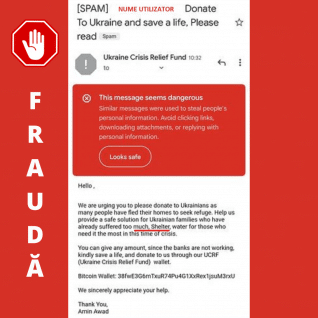 Directoratul a fost notificat despre apariția unei campanii de tip fraudă distribuită prin e-mail care este lansată de la adresa ukrarelief[@]unations[.]com. Domeniul unations.com apare în acest moment ca fiind de vânzare. Textul mesajului face apel la strângerea de fonduri pentru refugiații care fug din calea războiului din Ucraina prin Ukraine Crisis Relief Fund, iar metoda propusă de transmitere a banilor este un portofel de Bitcoin.
