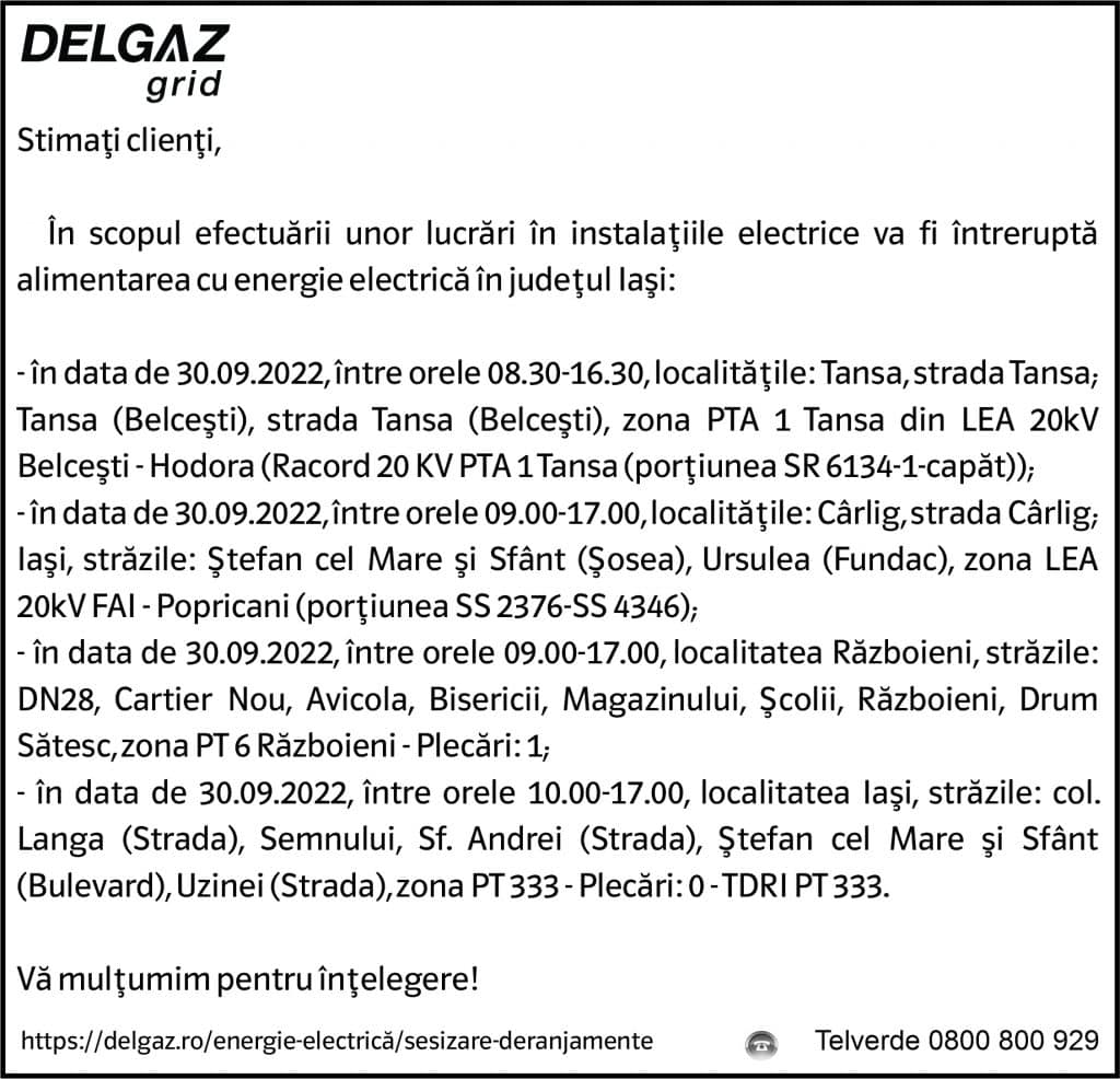 Anunțuri Delgaz gridAnunţ Delgaz Grid 27 septembrie 2022 / 1 de RedacțiaSeptember 26, 2022September 26, 2022081 Share0