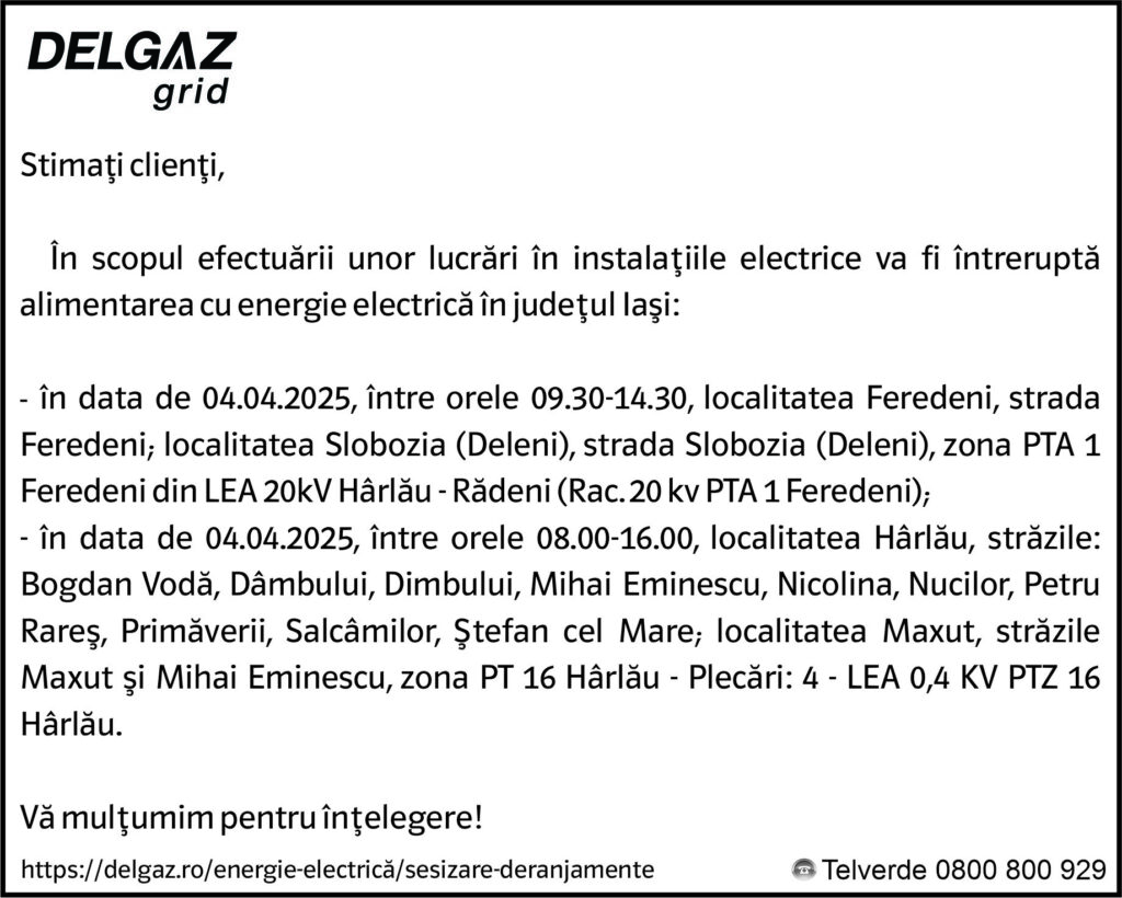 Anunțuri Delgaz gridAnunț Delgaz Grid 1 aprilie 2025 / 2 de RedacțiaApril 1, 2025April 1, 2025030 Share0