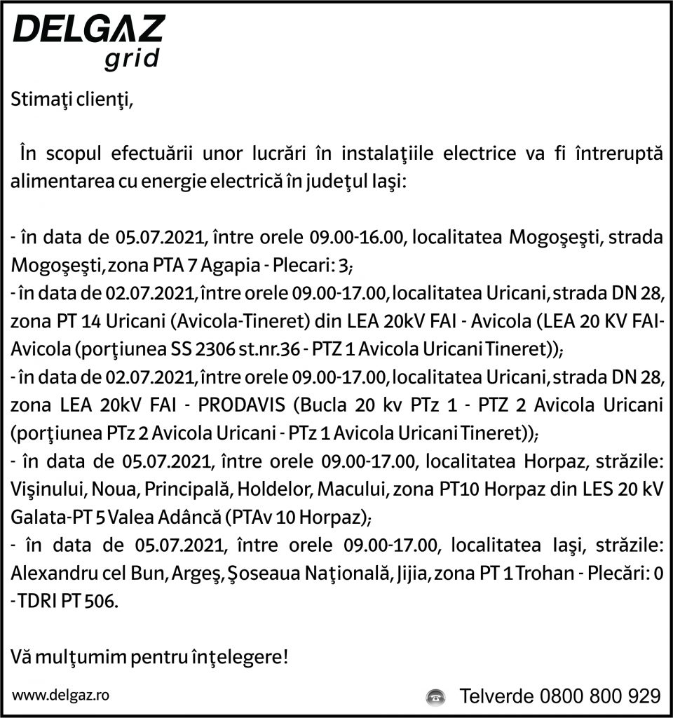 Anunțuri Delgaz gridAnunț Delgaz Grid 1 iulie 2021 / 1 de RedacțiaJune 30, 2021June 30, 2021063 Share0