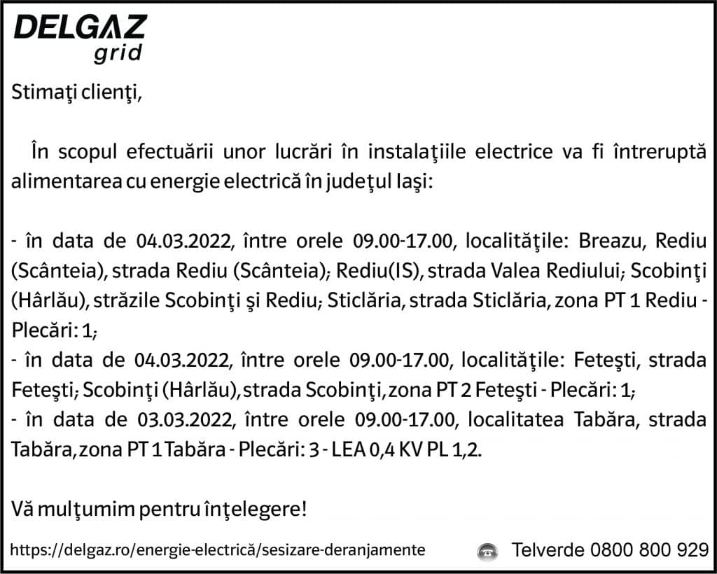 Anunțuri Delgaz gridAnunț Delgaz Grid 1 Martie 2022 / 3 de RedacțiaFebruary 28, 2022February 28, 2022040 Share0