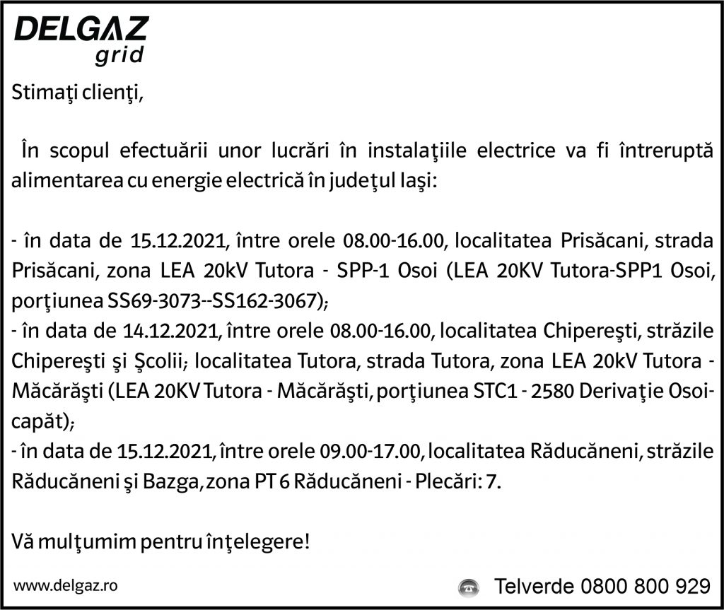 Anunțuri Delgaz gridAnunț Delgaz Grid 10 decembrie 2021 / 4 de RedacțiaDecember 9, 2021December 9, 2021031 Share0