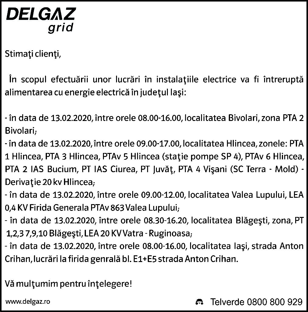 Anunțuri Delgaz gridAnunț Delgaz Grid 10 februarie 2020 / 2 de RedacțiaFebruary 8, 2020February 8, 20200346 Share0
