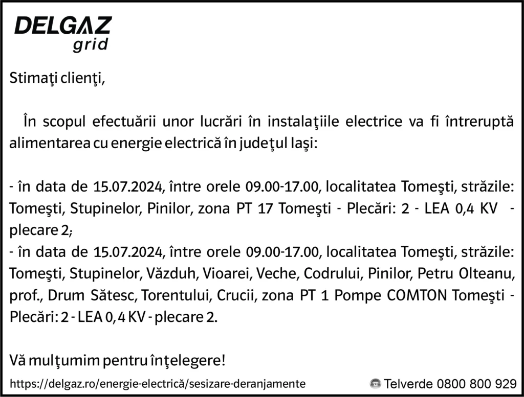 Anunțuri Delgaz gridAnunț Delgaz Grid 11 iulie 2024 / 2 de RedacțiaJuly 10, 2024July 10, 2024020 Share0