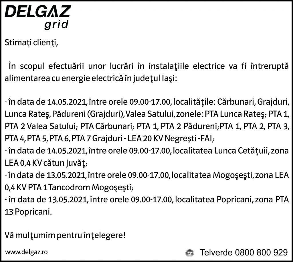 Anunț Delgaz Grid 11 mai 2021 / 2