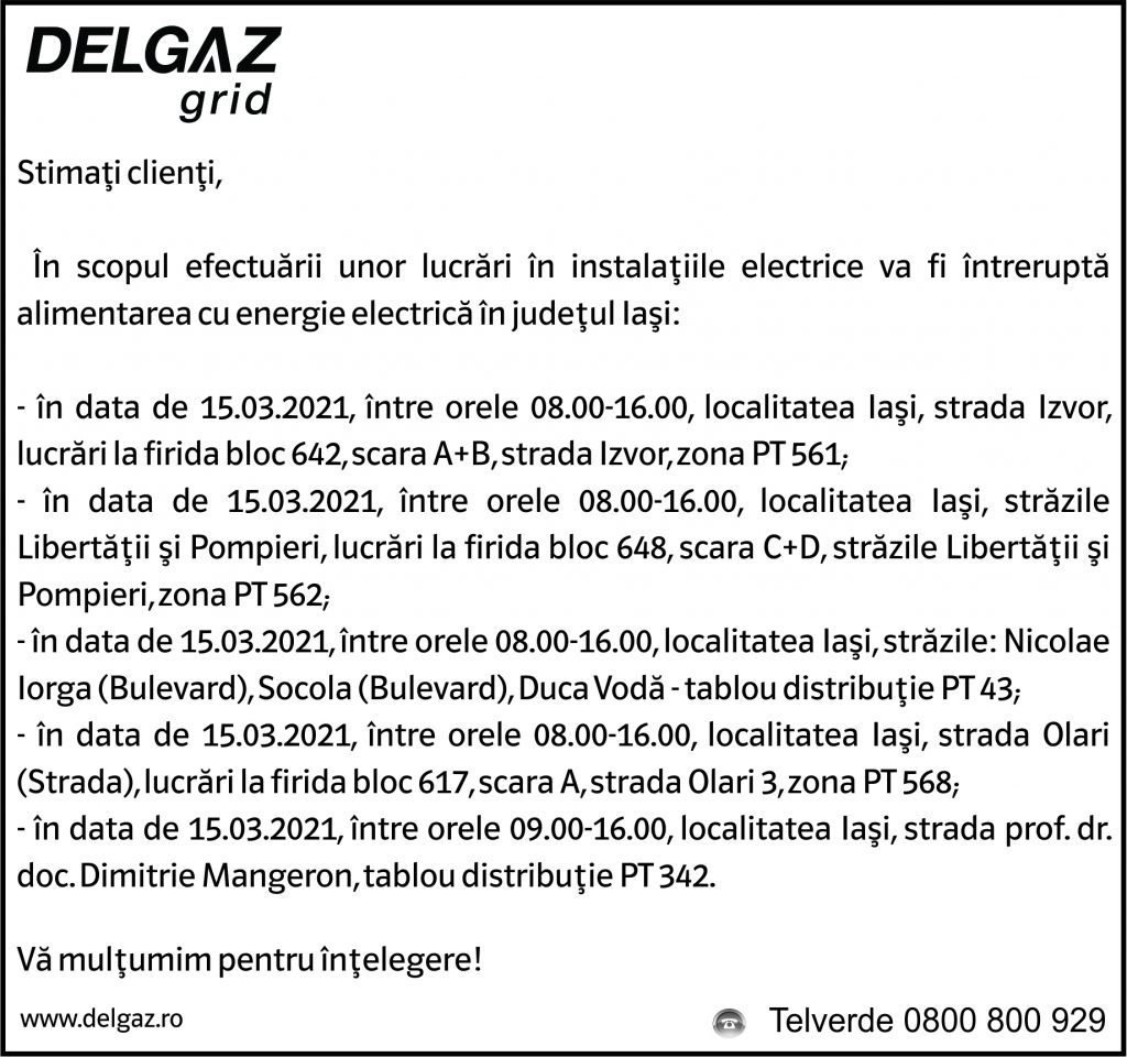 Anunțuri Delgaz gridAnunț Delgaz Grid 11 martie 2021 / 2 de RedacțiaMarch 10, 2021March 10, 2021054 Share0