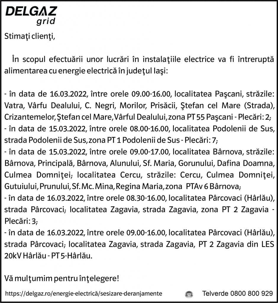 Anunțuri Delgaz gridAnunț Delgaz Grid 11 martie 2022 / 2 de RedacțiaMarch 10, 2022March 10, 2022033 Share0