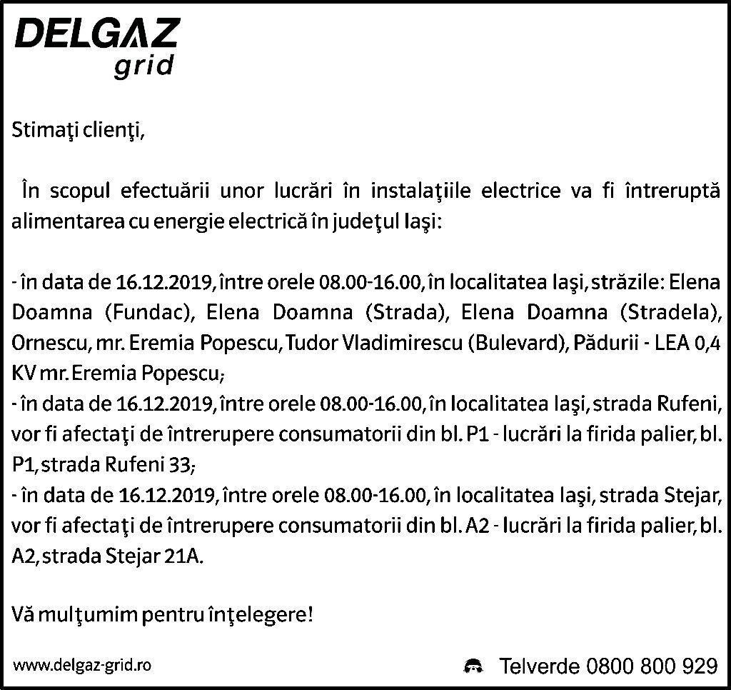 Anunțuri Delgaz gridAnunț Delgaz Grid 12 decembrie 2019 / 1 de RedacțiaDecember 11, 2019December 11, 20190161 Share0