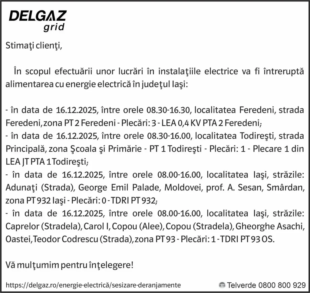Anunțuri Delgaz gridAnunț Delgaz Grid 12 decembrie 2025 / 1 de Răzvan GrecuDecember 11, 2025December 11, 202505 Share0
