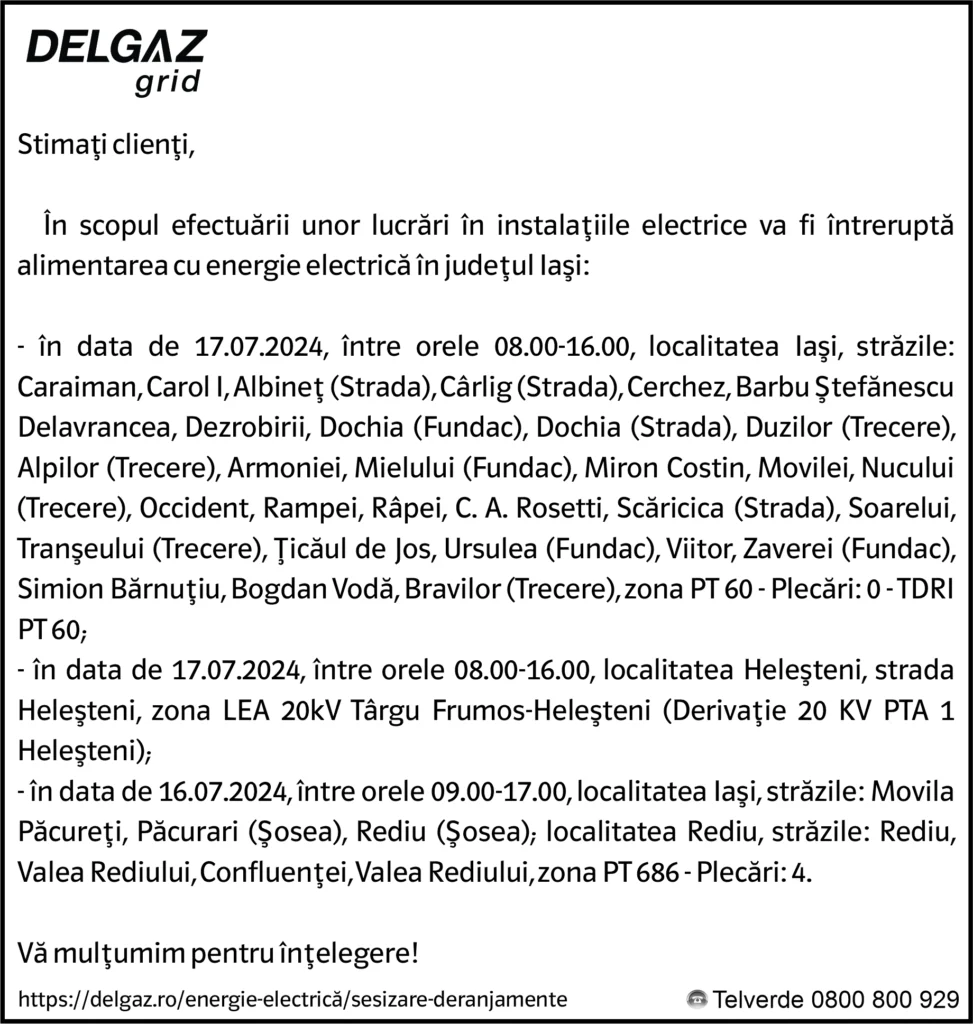 Anunțuri Delgaz gridAnunț Delgaz Grid 12 iulie 2024 / 2 de RedacțiaJuly 11, 2024July 11, 2024044 Share0