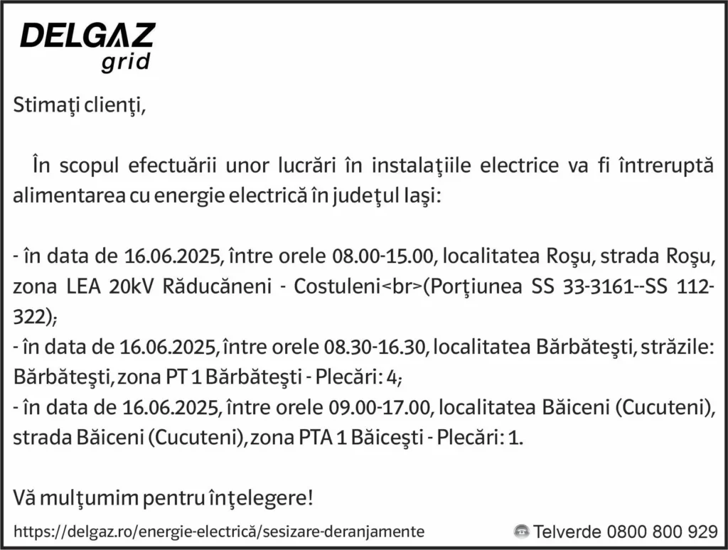 Anunț Delgaz Grid 12 iunie 2025