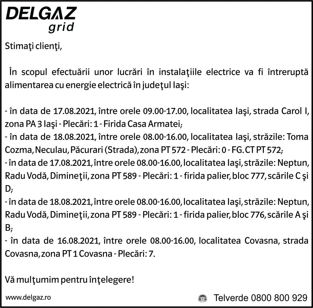 Anunțuri Delgaz gridAnunț Delgaz Grid 13 august 2021 / 3 de RedacțiaAugust 13, 2021August 13, 2021027 Share0