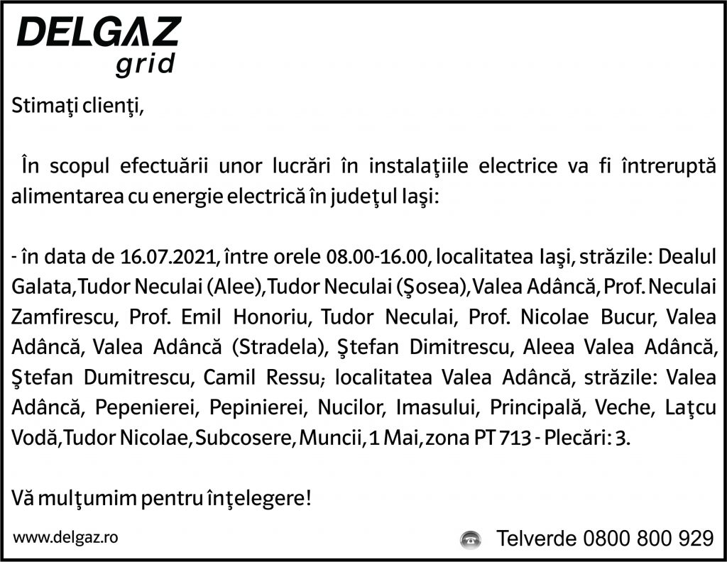 Anunțuri Delgaz gridAnunț Delgaz Grid 13 iulie 2021 / 2 de RedacțiaJuly 12, 2021July 12, 2021015 Share0