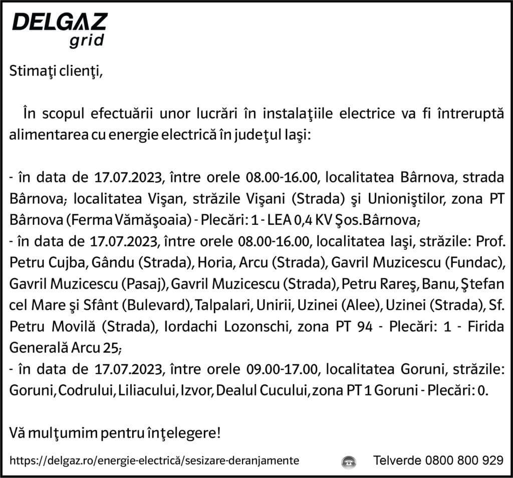 Anunț Delgaz Grid 13 iulie 2023