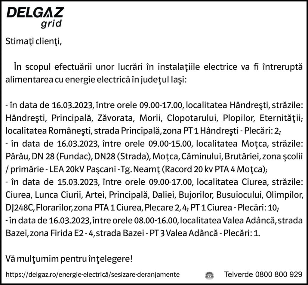 Anunțuri Delgaz gridAnunț Delgaz Grid 13 martie 2023 / 1 de RedacțiaMarch 12, 2023March 12, 2023086 Share0