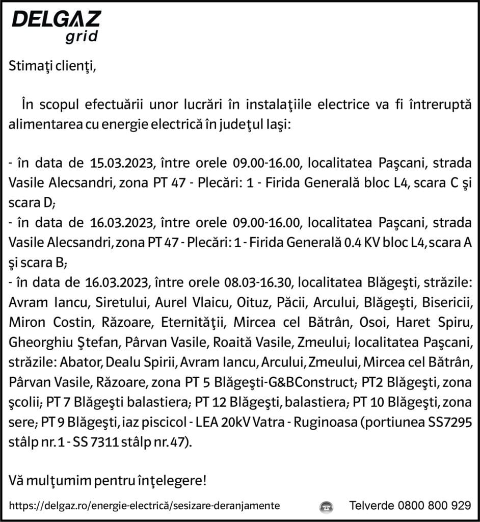 Anunțuri Delgaz gridAnunț Delgaz Grid 13 martie 2023 / 2 de RedacțiaMarch 12, 2023March 12, 20230160 Share0