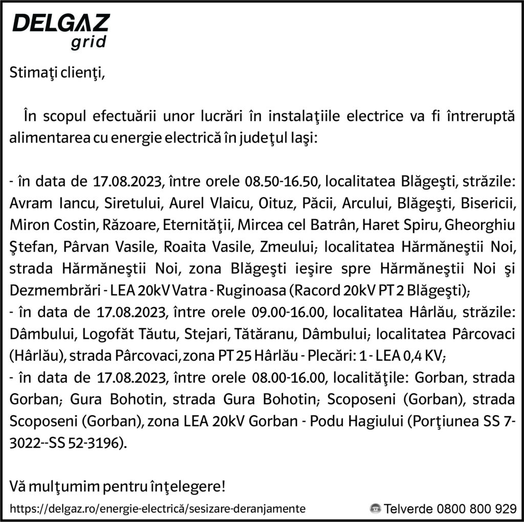 Anunțuri Delgaz gridAnunț Delgaz Grid 14 august 2023 / 2 de RedacțiaAugust 12, 2023August 12, 2023085 Share0