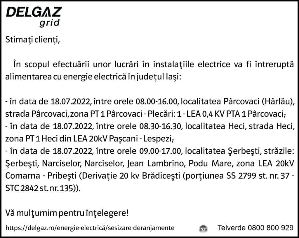 Anunțuri Delgaz gridAnunț Delgaz Grid 14 iulie 2022 / 2 de RedacțiaJuly 13, 2022July 13, 2022072 Share0