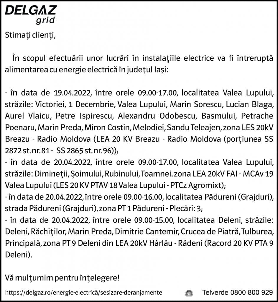 Anunțuri Delgaz gridAnunț Delgaz Grid 15 aprilie 2022 / 1 de RedacțiaApril 14, 2022April 14, 2022037 Share0