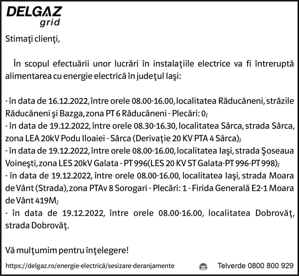 Anunțuri Delgaz gridAnunț Delgaz Grid 15 decembrie 2022 de RedacțiaDecember 14, 2022December 14, 2022094 Share0