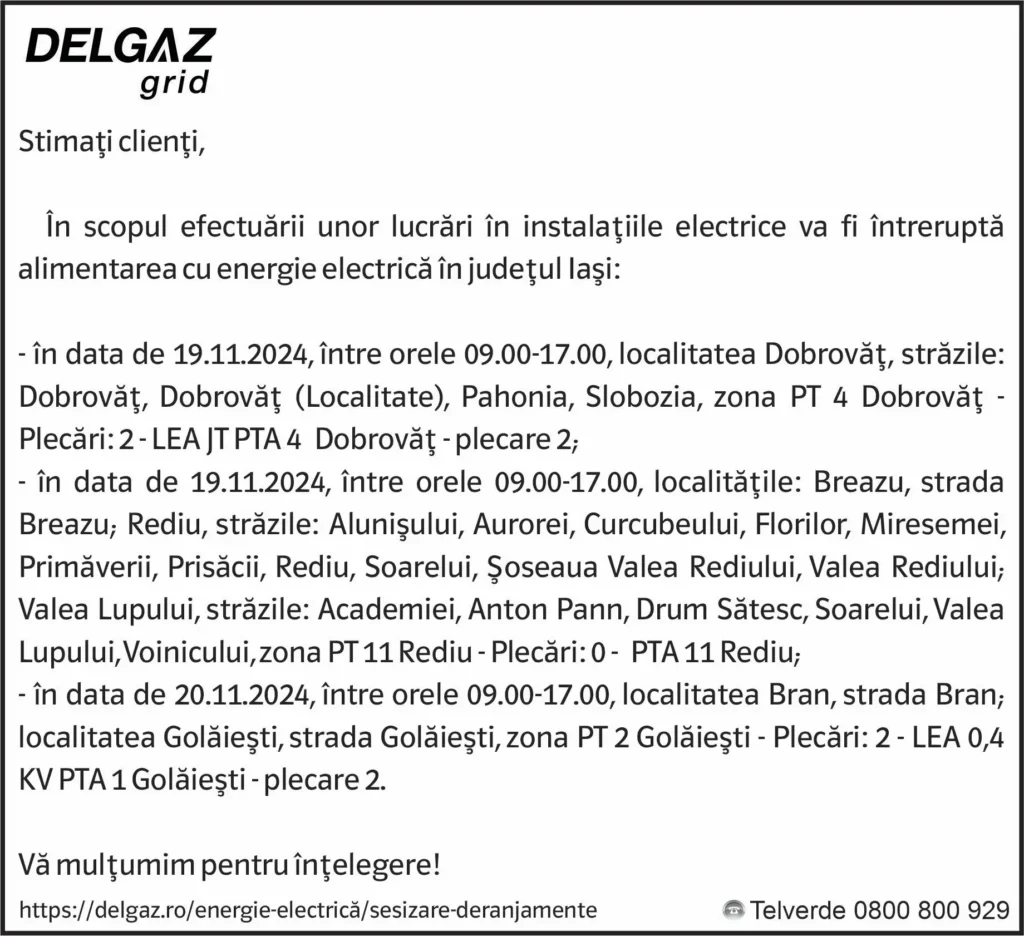 Anunțuri Delgaz gridAnunț Delgaz Grid 15 noiembrie 2024 / 2 de RedacțiaNovember 14, 2024November 14, 2024019 Share0