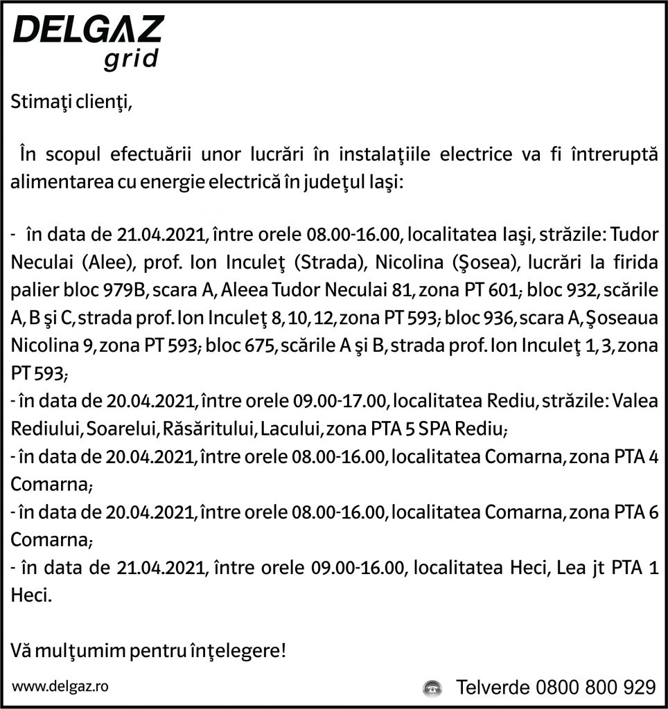Anunțuri Delgaz gridAnunț Delgaz Grid 16 aprilie 2021 / 2 de RedacțiaApril 15, 2021April 15, 2021020 Share0