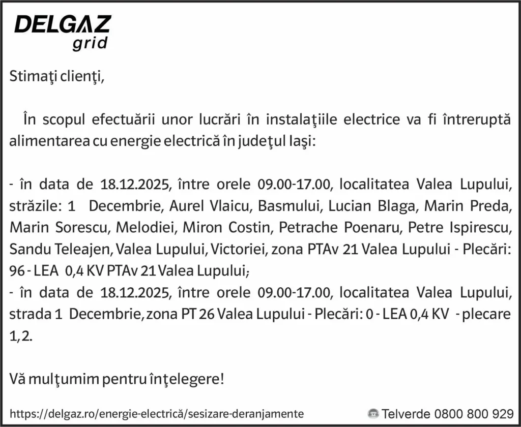 Anunțuri Delgaz gridAnunț Delgaz Grid 16 decembrie 2025 / 2 de Răzvan GrecuDecember 15, 2025December 15, 2025011 Share0