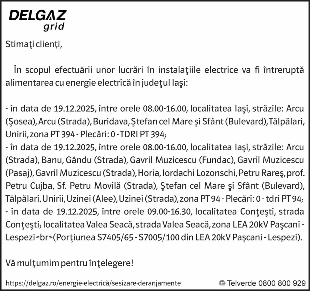 Anunțuri Delgaz gridAnunț Delgaz Grid 17 decembrie 2025 / 1 de Răzvan GrecuDecember 17, 2025December 17, 202506 Share0