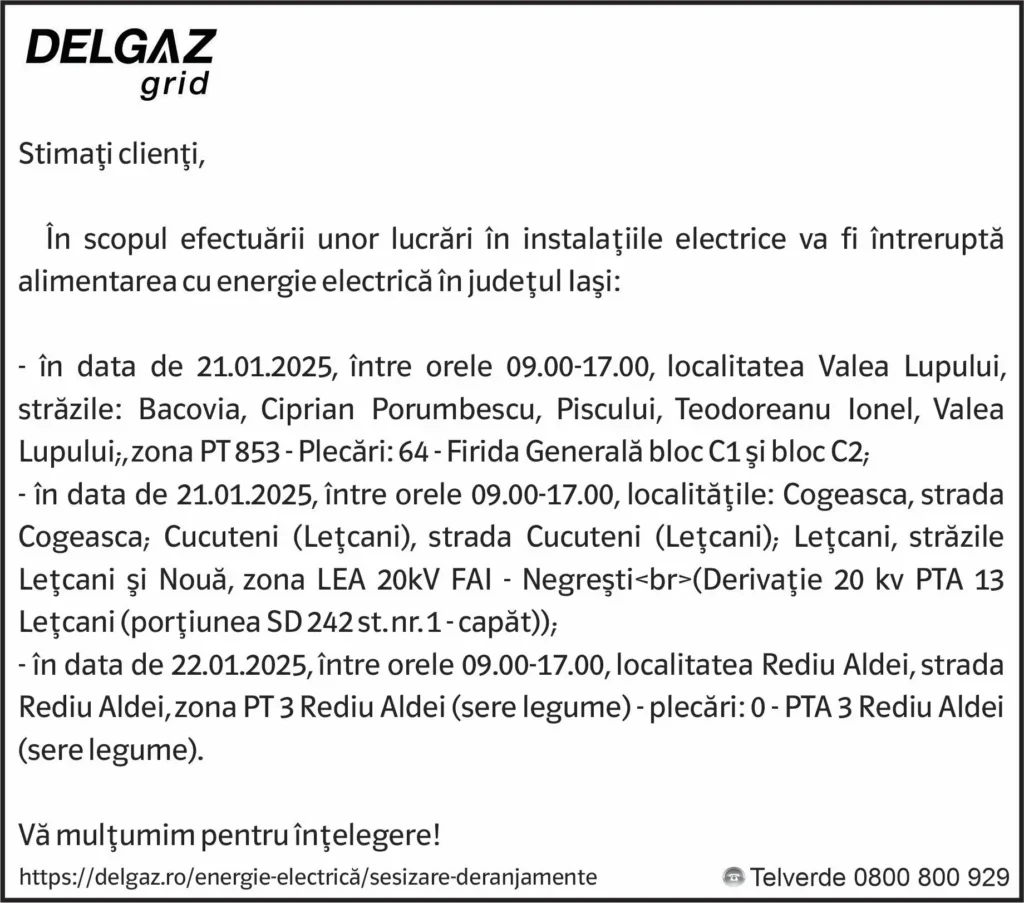 Anunțuri Delgaz gridAnunț Delgaz Grid 17 ianuarie 2025 / 3 de RedacțiaJanuary 16, 2025January 16, 2025027 Share0