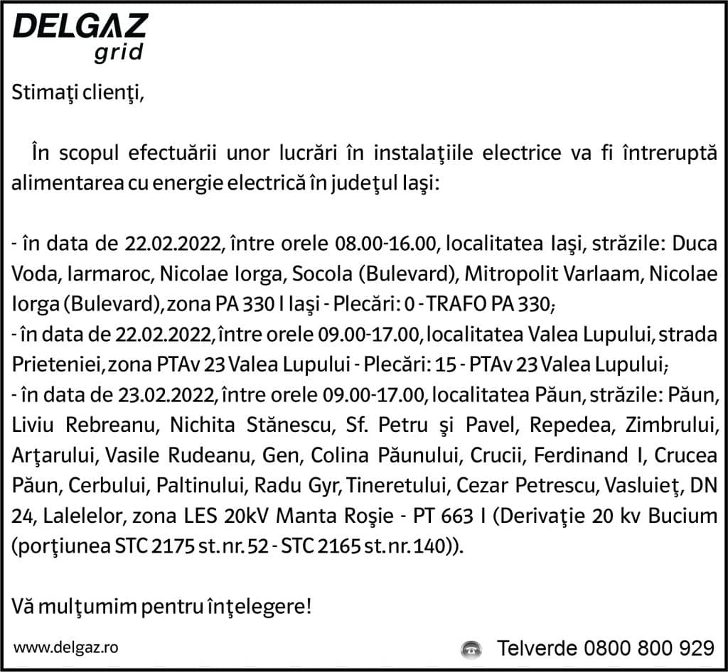 Anunțuri Delgaz gridAnunț Delgaz Grid 18 februarie 2022 / 3 de RedacțiaFebruary 17, 2022February 17, 2022055 Share0