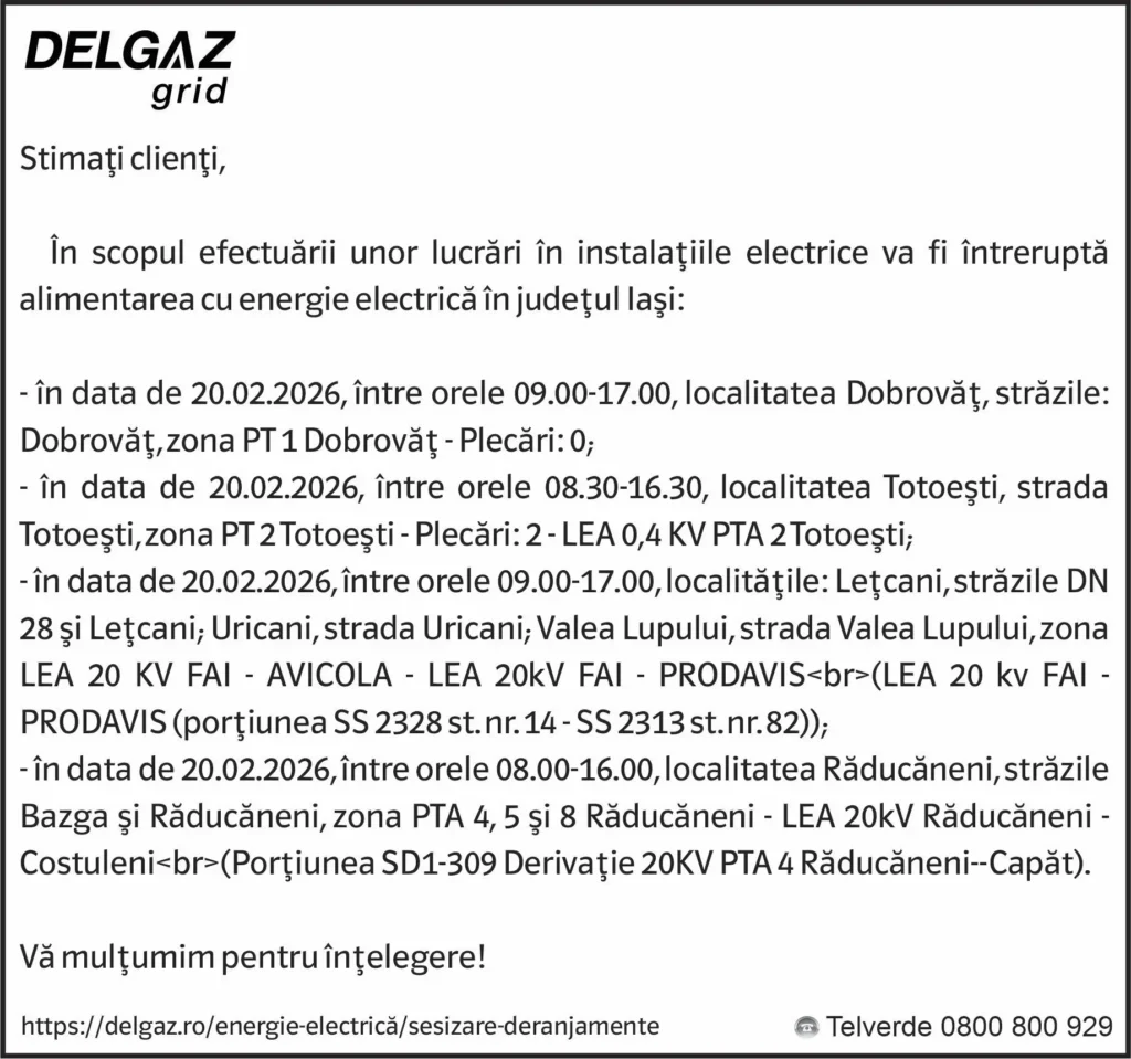 Anunțuri Delgaz gridAnunț Delgaz Grid 18 februarie 2026 de Răzvan GrecuFebruary 17, 2026February 17, 202602 Share0