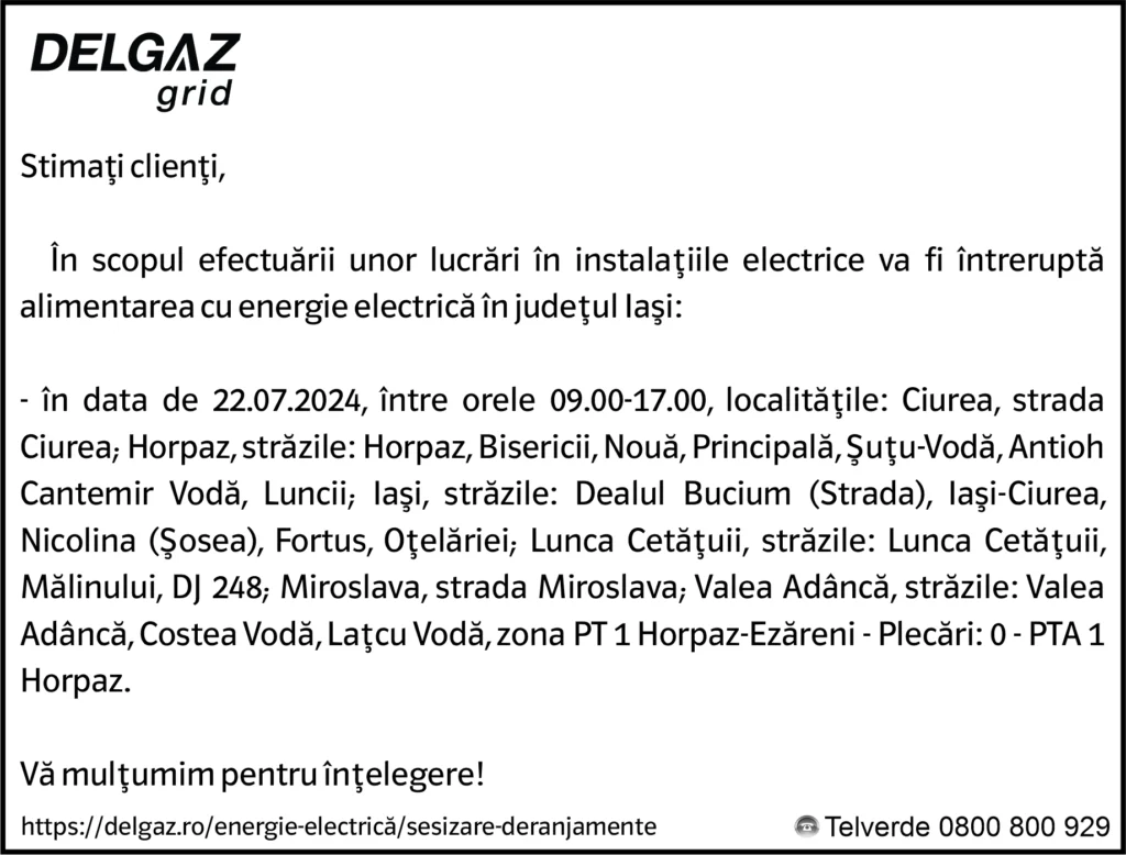 Anunțuri Delgaz gridAnunț Delgaz Grid 18 iulie 2024 / 1 de RedacțiaJuly 17, 2024July 17, 2024017 Share0