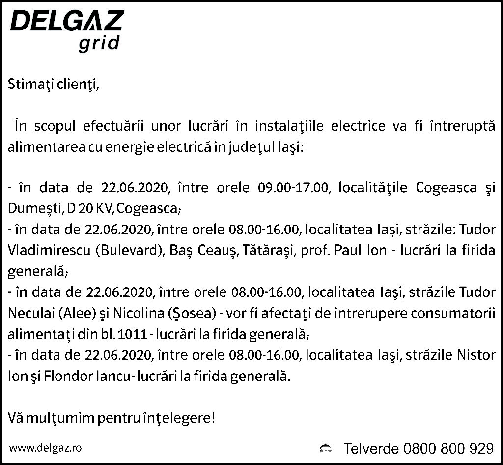 Anunțuri Delgaz gridAnunț Delgaz Grid 18 iunie 2020 / 1 de RedacțiaJune 17, 2020June 17, 2020075 Share0