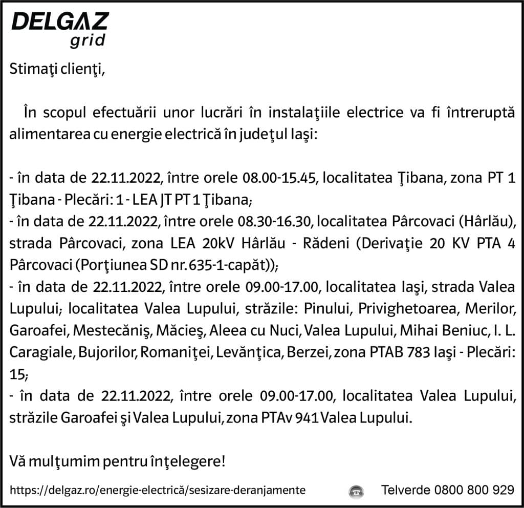 Anunțuri Delgaz gridAnunț Delgaz Grid 18 noiembrie 2022 / 1 de RedacțiaNovember 17, 2022November 17, 2022048 Share0