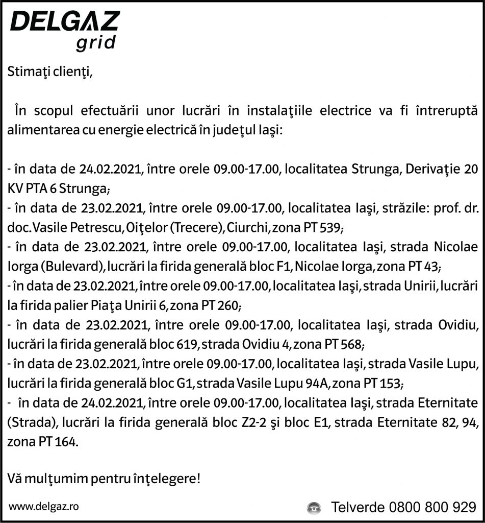 Anunțuri Delgaz gridAnunț Delgaz Grid 19 februarie 2021 / 1 de RedacțiaFebruary 18, 2021February 18, 2021034 Share0