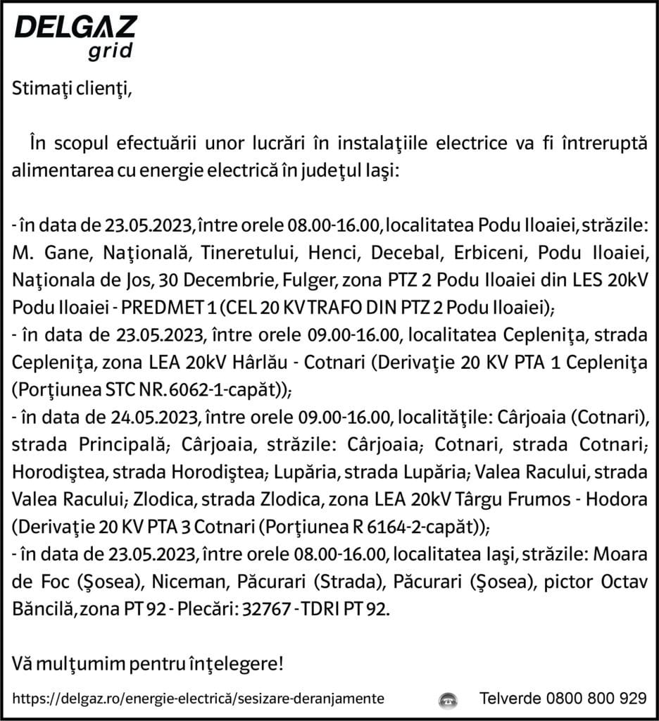 Anunț Delgaz Grid 19 mai 2023 / 1