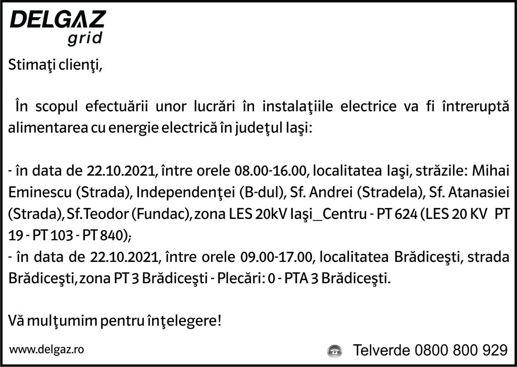 Anunțuri Delgaz gridAnunț Delgaz Grid 19 octombrie 2021 de RedacțiaOctober 18, 2021October 18, 2021068 Share0