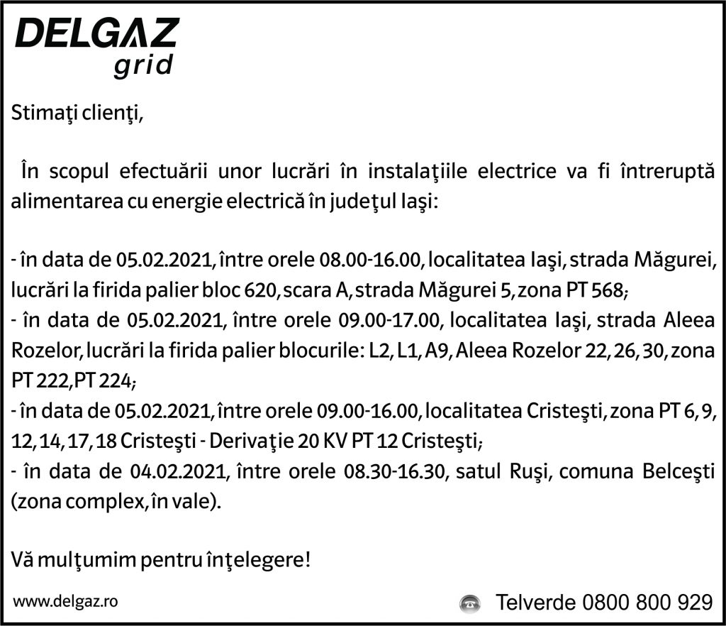 Anunțuri Delgaz gridAnunț Delgaz Grid 2 februarie 2021 / 1 de RedacțiaFebruary 1, 2021February 1, 2021020 Share0