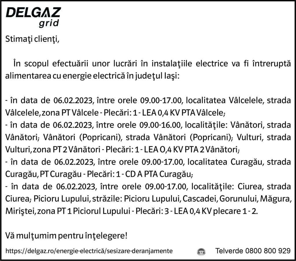 Anunțuri Delgaz gridAnunț Delgaz Grid 2 februarie 2023 / 2 de RedacțiaFebruary 2, 2023February 2, 2023058 Share0