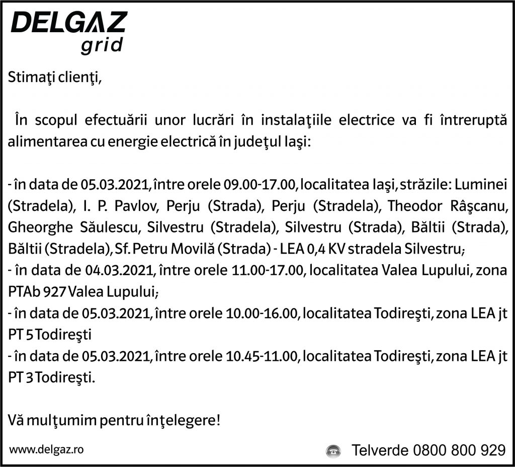 Anunțuri Delgaz gridAnunț Delgaz Grid 2 martie 2021 / 2 de RedacțiaMarch 1, 2021March 1, 2021013 Share0