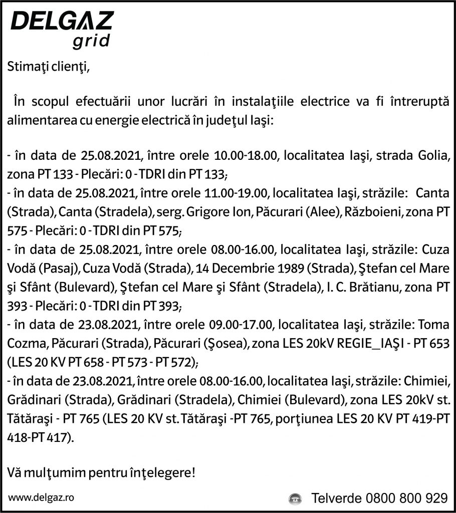 Anunțuri Delgaz gridAnunț Delgaz Grid 20 august 2021 / 3 de RedacțiaAugust 19, 2021August 19, 2021035 Share0