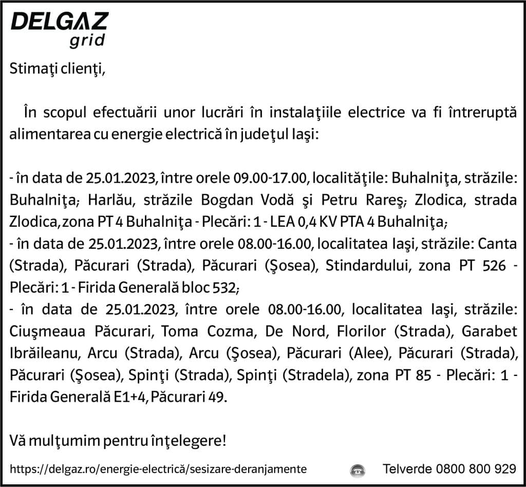 Anunțuri Delgaz gridAnunț Delgaz Grid 20 ianuarie 2023 / 1 de RedacțiaJanuary 19, 2023January 19, 20230110 Share0