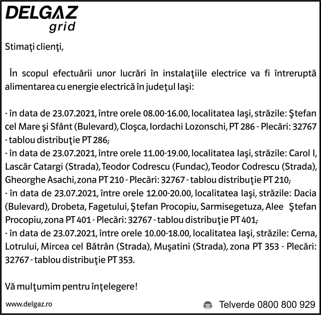 Anunțuri Delgaz gridAnunț Delgaz Grid 20 iulie 2021 / 1 de RedacțiaJuly 19, 2021July 19, 2021039 Share0