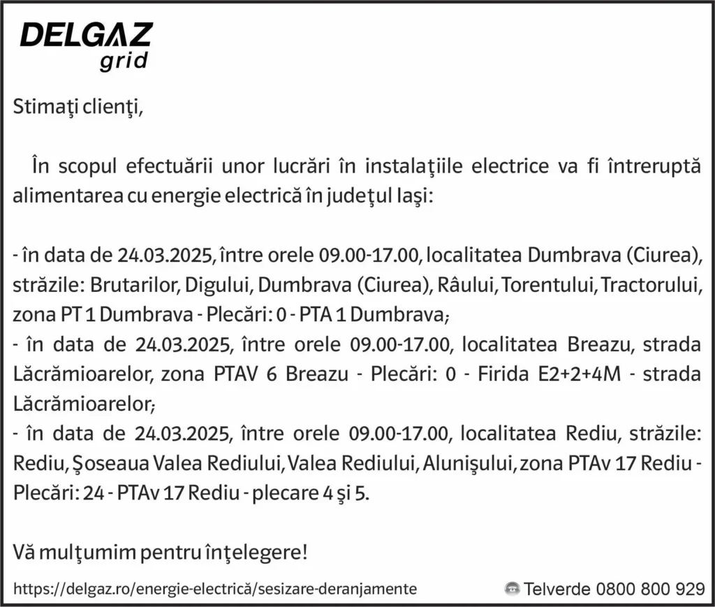 Anunțuri Delgaz gridAnunț Delgaz Grid 20 martie 2025 / 2 de RedacțiaMarch 19, 2025March 19, 2025019 Share0