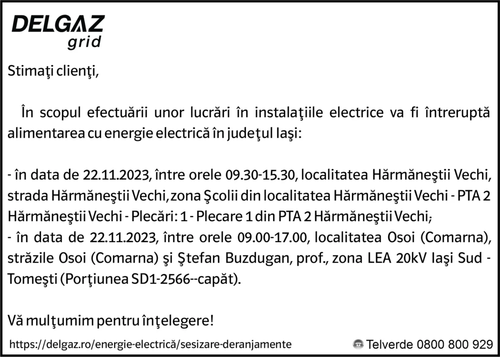 Anunțuri Delgaz gridAnunț Delgaz Grid 20 noiembrie 2023 / 2 de RedacțiaNovember 19, 2023November 19, 2023088 Share0