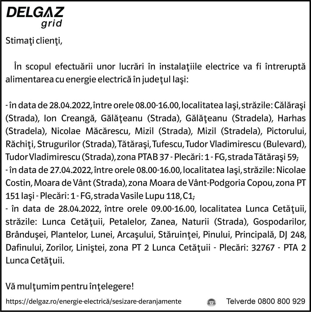 Anunțuri Delgaz gridAnunț Delgaz Grid 21 aprilie 2022 de RedacțiaApril 20, 2022April 20, 2022045 Share0